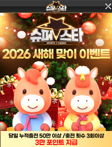 슈퍼스타 새해이벤트 떳어요 메이져사이트인만큼 게임도 진짜 다양하고 충환전도 정말 빠르고 좋아서 꾸준히 잘 이용하고있네요